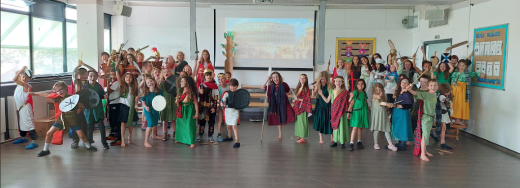 Ms. Niya: The songs were also available on the BBC – we just shortened them as they were too long. I found the Latin one ‘Per Aspera’ – our opening song – on YouTube. Ms. Julia sent me a bunch of German songs too in which I found “I’m Amphitheater” which was perfect! It’s worth noting how impressed Mr. Aiden was how quickly they learnt the Latin song, which he put down to us being a bilingual school and them having extra special bilingual ability. Last week, I found our closing song “Rocking Romans” which was perfect. It’s funny how shows all come together somehow – I love that about the theatre.