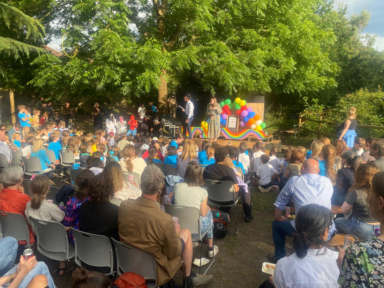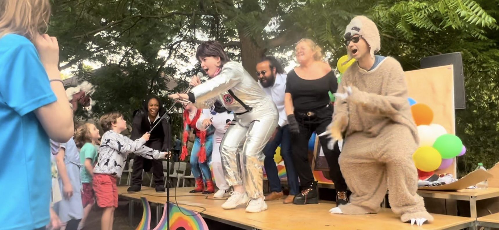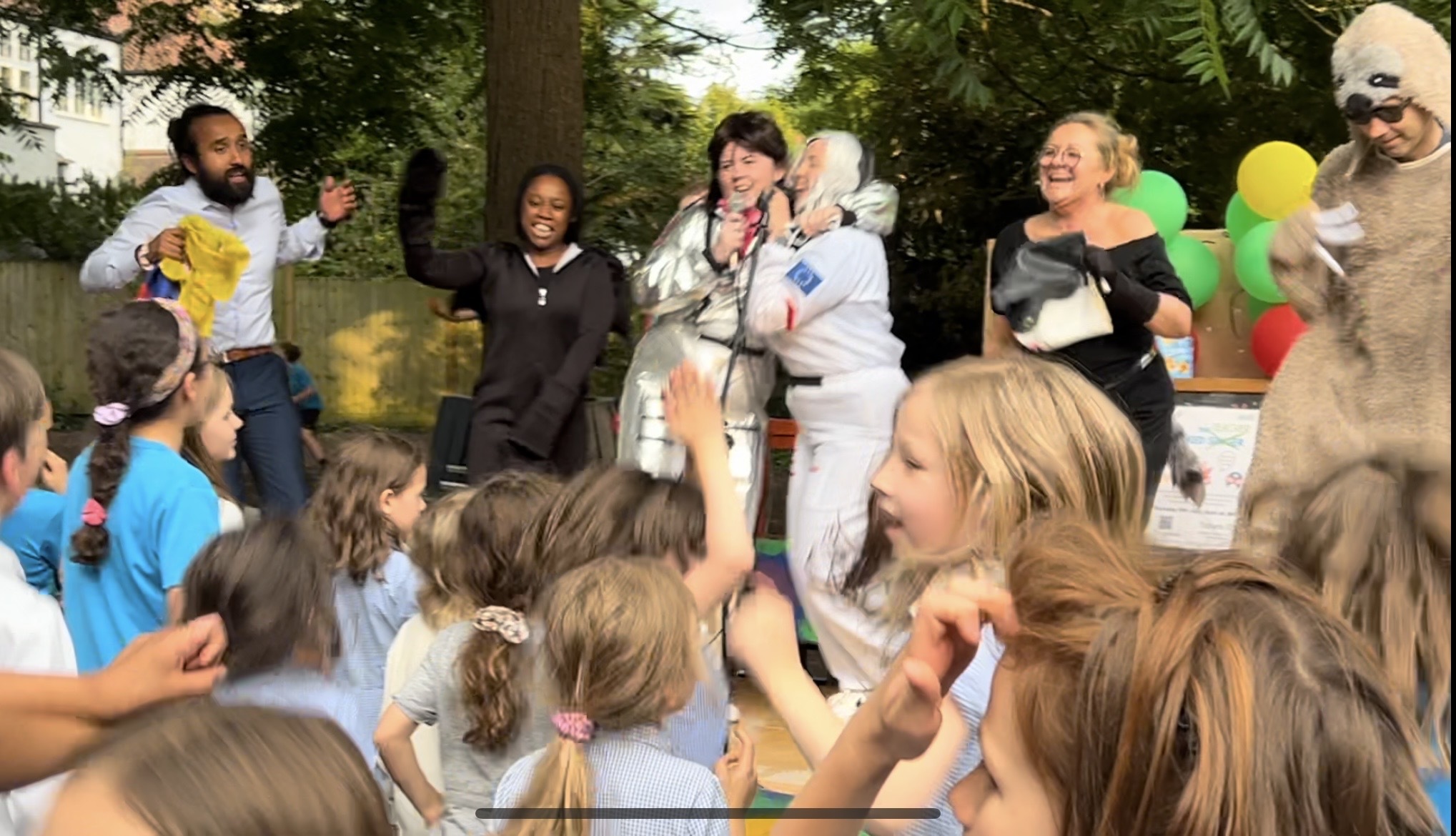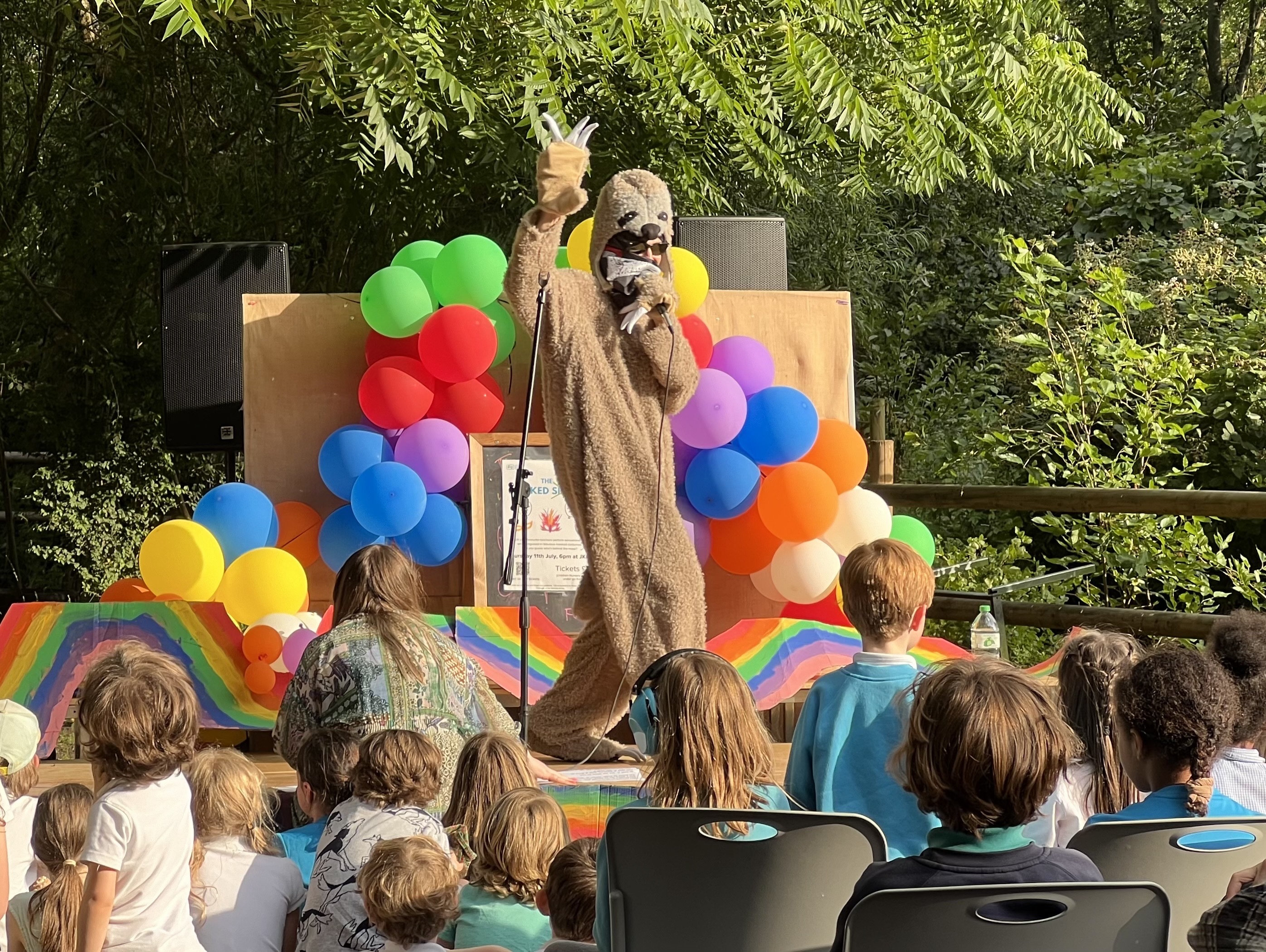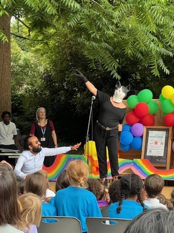 The first to step up was a sloth which was soon revealed to be our headteacher Mr. Patrick. He first tried to scale a nearby tree before crawling onto the stage with his big claws scratching the floor. He danced and sang to “Beat It” by Michael Jackson, trying to change his voice to lead us on a false trail. But his plan backfired leading to loads of children shouting out “It’s Mr. Patrick!!” when Coach Leo asked them to guess who was underneath the furry outfit.