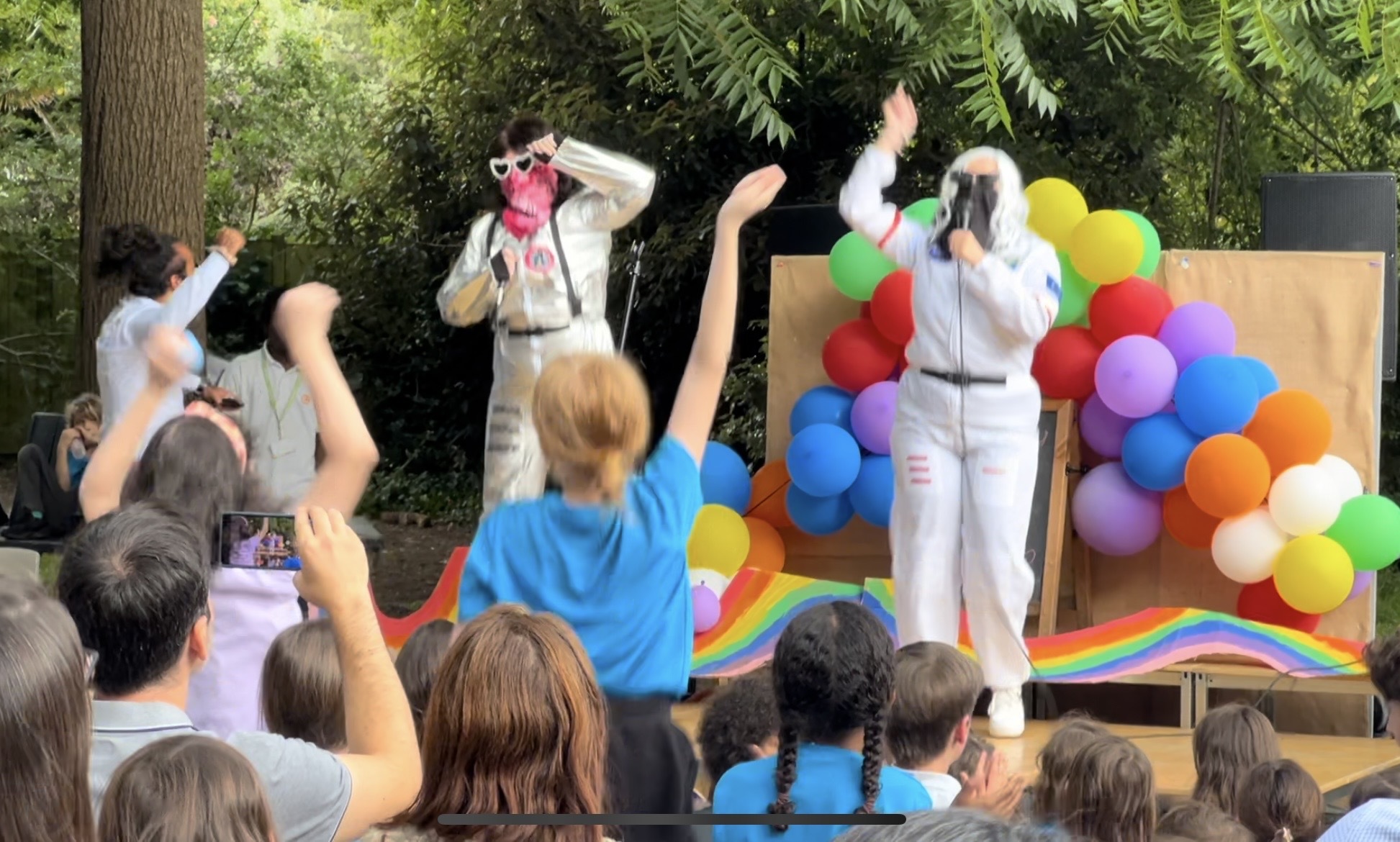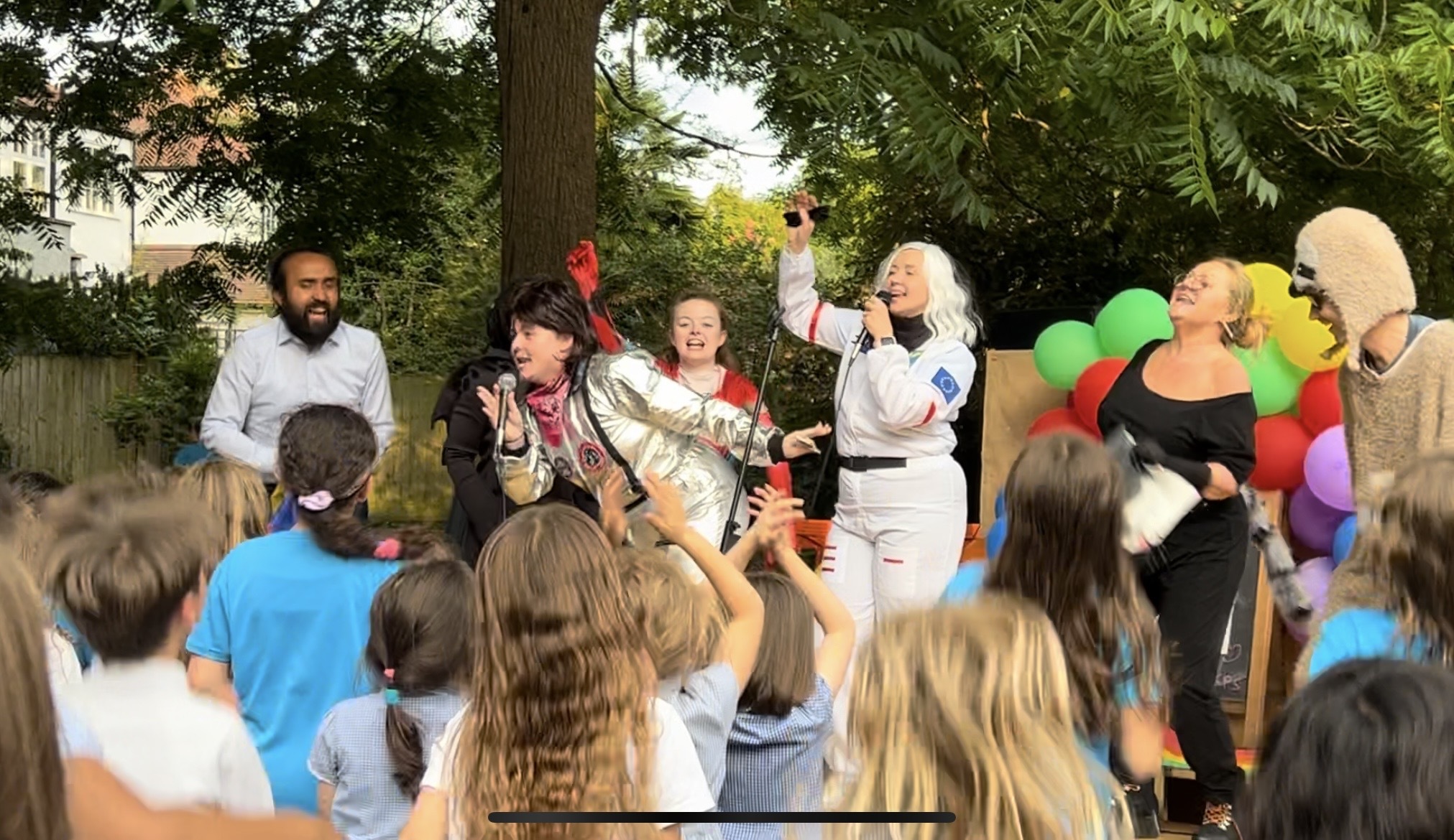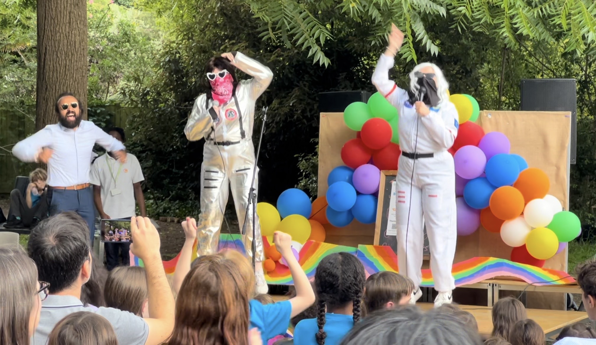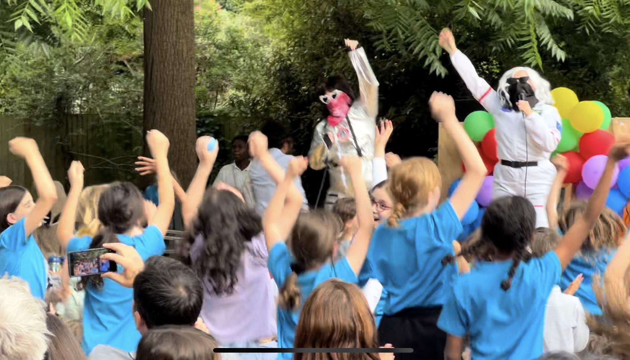 The third act was the legendary Spiderman singing the song “C’est La Vie”. Instead of flying in from America, this female spidery friend webbed her way from Ireland and did an Irish jig on the stage. One of our intrepid Mog Chronicle reporters had worked out the identity of the secret superhero because she spotted Spidey rushing through the Early Years area shortly before taking to the stage. But Ms. Mary deceived many others who had no idea who she was.